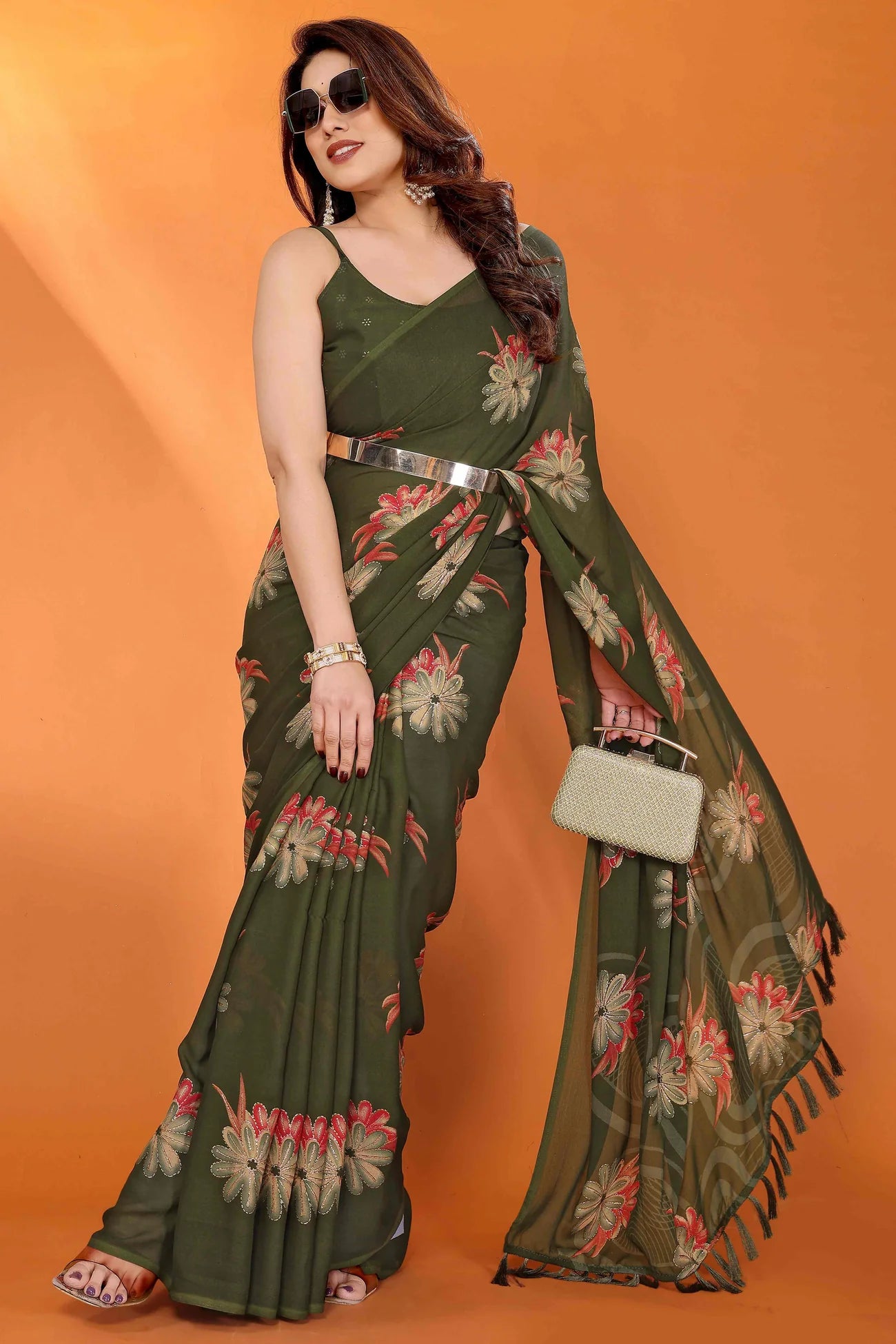 - Chic & Comfortable: This mehendi green satin saree showcases a graceful floral print that enhances its timeless charm.
